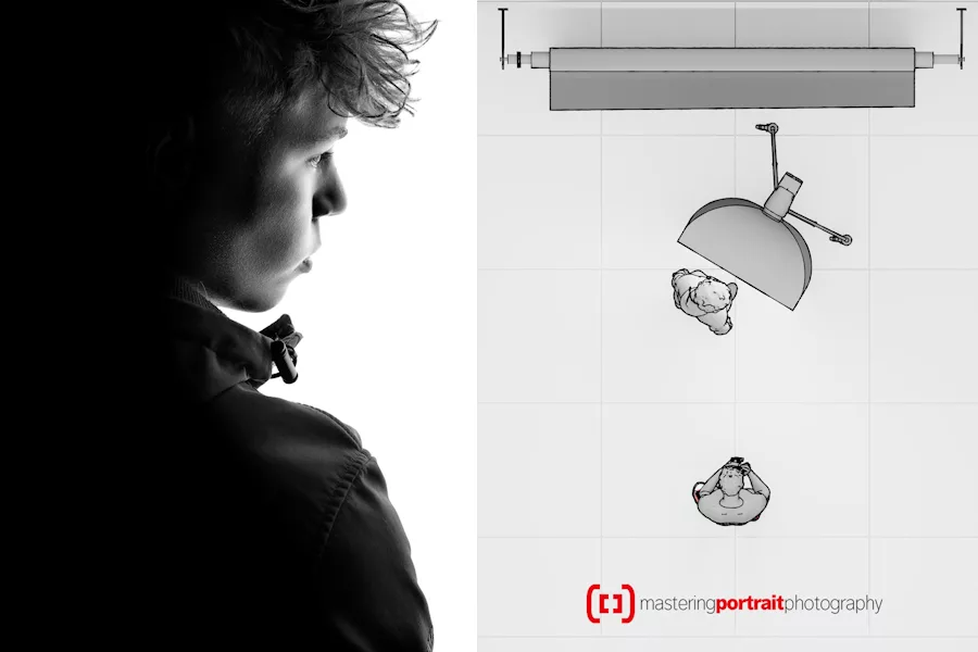 2: Coloque al sujeto estrictamente de lado, mirando a la cámara hacia la derecha. Ahora mueva la caja de luz hacia la cámara justo hasta que la superficie de la caja de luz esté detrás de la oreja y el hombro derechos, aproximadamente a las 4 o 5 en punto en relación con el sujeto.
