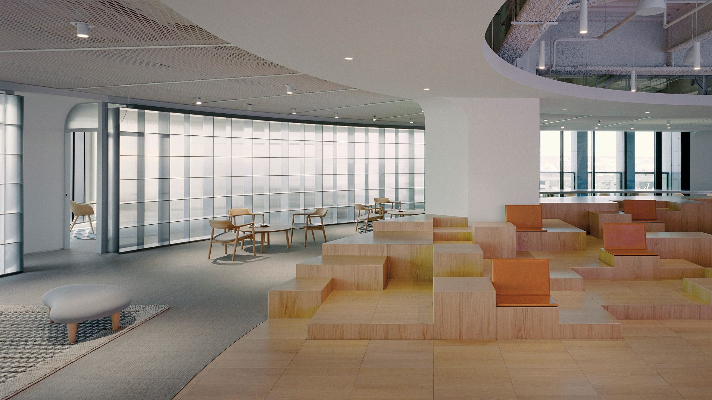 Las salas de reuniones completamente cerradas ubicadas en las cuatro esquinas del perímetro están revestidas con cubículos de vidrio acanalado que difunden la luz natural, permitiéndole penetrar en el foro.