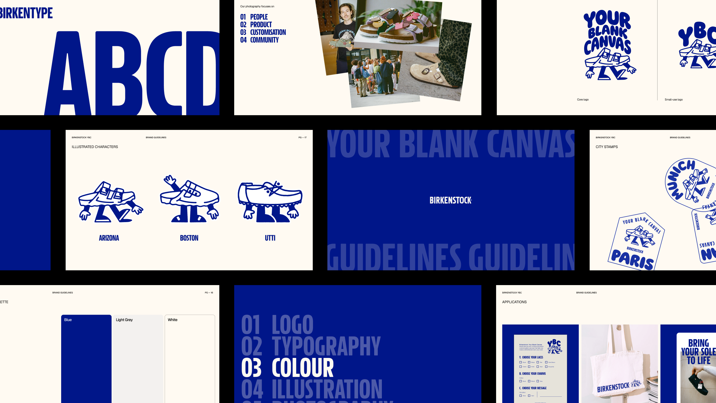 En el corazón del nuevo logotipo se encuentran tres divertidas mascotas basadas en los estilos Arizona, Boston y Utti de Birkenstock. Los personajes transforman la silueta reconocible al instante del zapato en personajes animados que encarnan una sensación de alegría y autoexpresión. Es un movimiento audaz para una marca cuyo lenguaje visual a menudo tiene sus raíces en un diseño alemán simple y utilitario, pero cuya ejecución hace una declaración manteniendo el distintivo Birkenstock.