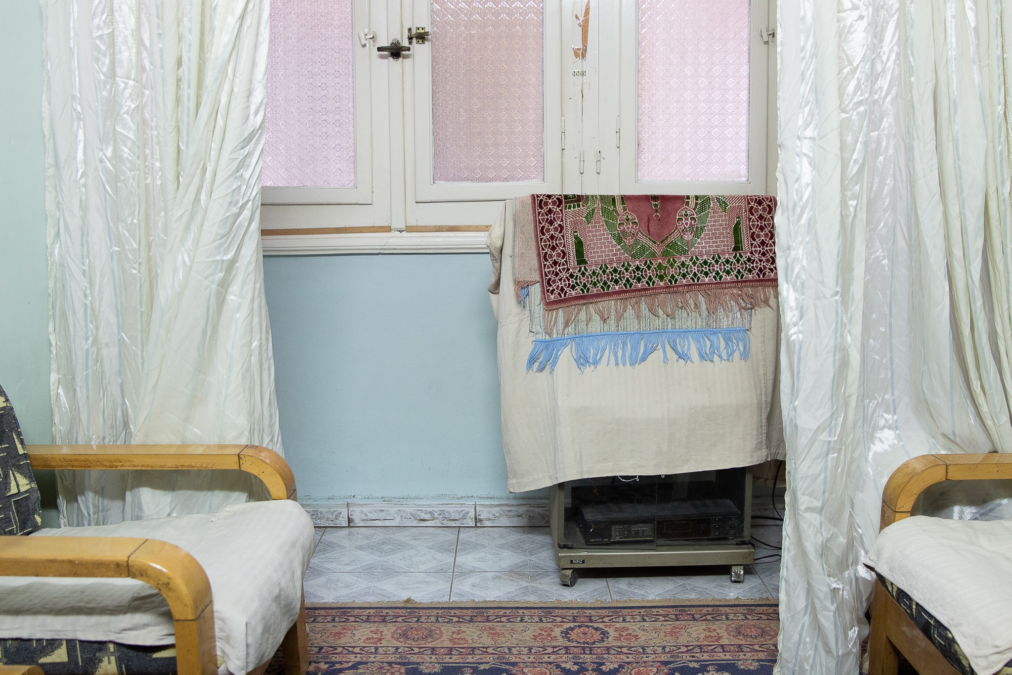 En otra serie, Fata7i ya warda, El Beyaly celebra el mundo visual mundano de Egipto, que a nosotros, el mundo árabe, a menudo se nos dice que es “vergonzoso” o “de mal gusto”. En una escena, vemos una jarra de plástico de mármol rosa frente a un grifo de color rosa claro y paredes rosas. El Beyaly se sorprendió cuando le dije que esta era mi foto favorita de la serie; le dije que esta foto me hacía extrañar a la familia árabe en la que crecí cuando era niña.
