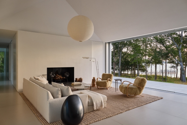 El vidrio del piso al techo en la sala de estar borra el límite entre el interior y el césped, enfatizando la tranquila bahía más allá.