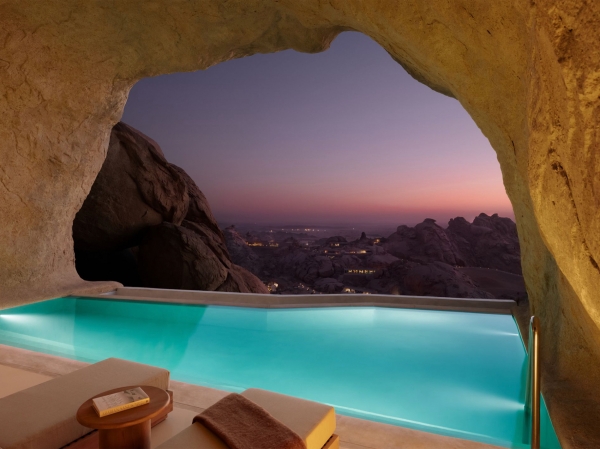 Villa Wadi cuenta con una piscina pequeña privada y una amplia sala de estar frente al paisaje natural. La villa situada en un acantilado ofrece vistas a gran altitud del desierto y una conexión visual directa con el cañón circundante.