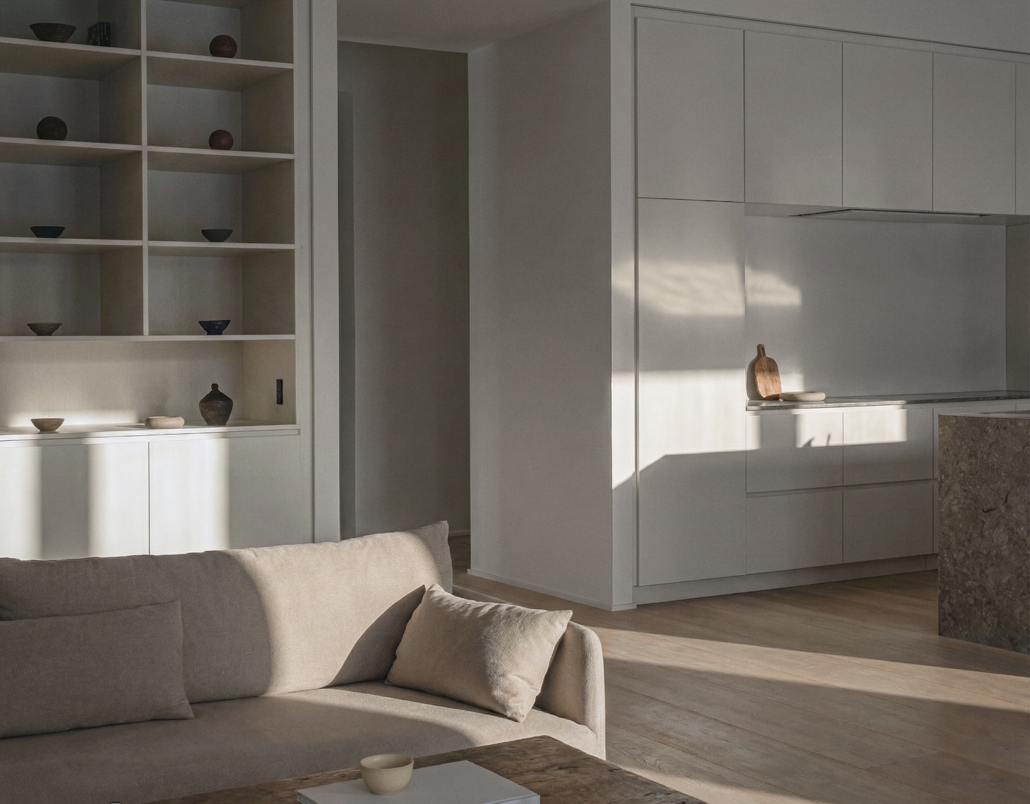 La elección de los materiales interiores es igualmente económica. La piedra, la madera y los textiles se introducen no como capas decorativas sino como contrapeso a la claridad arquitectónica: cada superficie elegida por su comportamiento táctil y su capacidad para registrar la luz, la humedad y el tiempo. Las hornacinas talladas en muros y volúmenes son uno de los elementos más resueltos del proyecto. Estos huecos proporcionan el mismo estatus que el espacio de almacenamiento y exhibición del edificio mismo, absorbiendo los rituales diarios en la estructura de la casa en lugar de tratarlos como una ocurrencia tardía. La cálida madera utilizada para estos nichos se diferencia de los materiales estructurales circundantes, aportando profundidad sin alterarla.