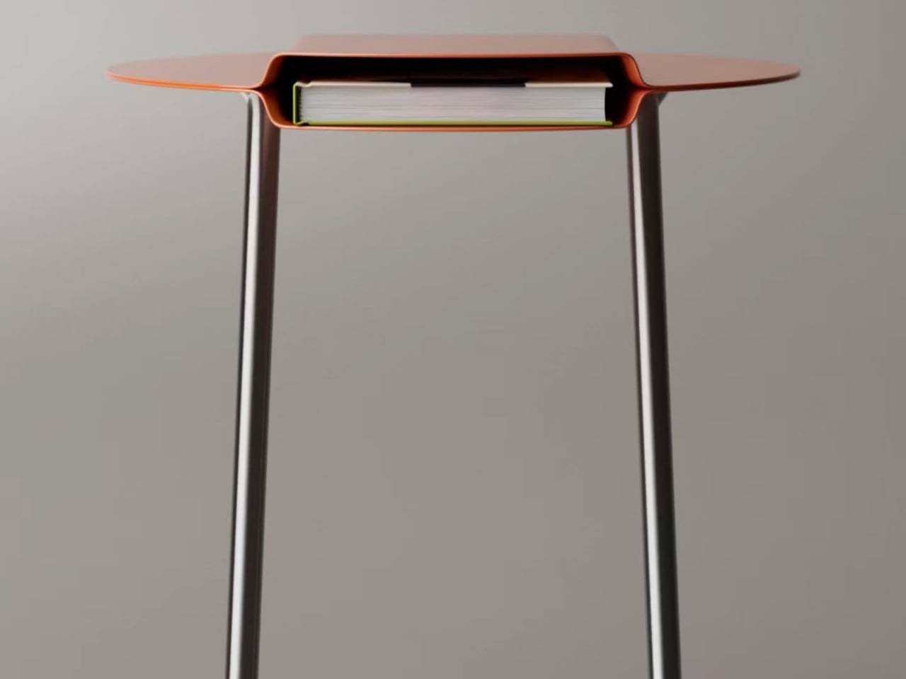 Vista desde arriba, la geometría se vuelve casi gráfica. Un círculo naranja plano con un rectángulo presionado en el centro y dos crestas diagonales afiladas que se abren en abanico hacia el borde del disco. Tiene la topografía que esperarías de un mapa topográfico o un modelo arquitectónico, superficies que transmiten profundidad e intención antes de que conozcas su funcionalidad. Incluso si no hay ningún libro dentro, la mesa llamará tu atención. La cavidad no desaparece cuando se vacía; se convierte en un detalle compositivo, una caja de sombra presionada en el metal.