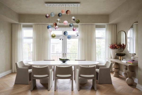 Los accesorios de iluminación personalizados marcan los espacios sociales, resaltando los tonos neutros de las maderas cálidas y los textiles suaves.