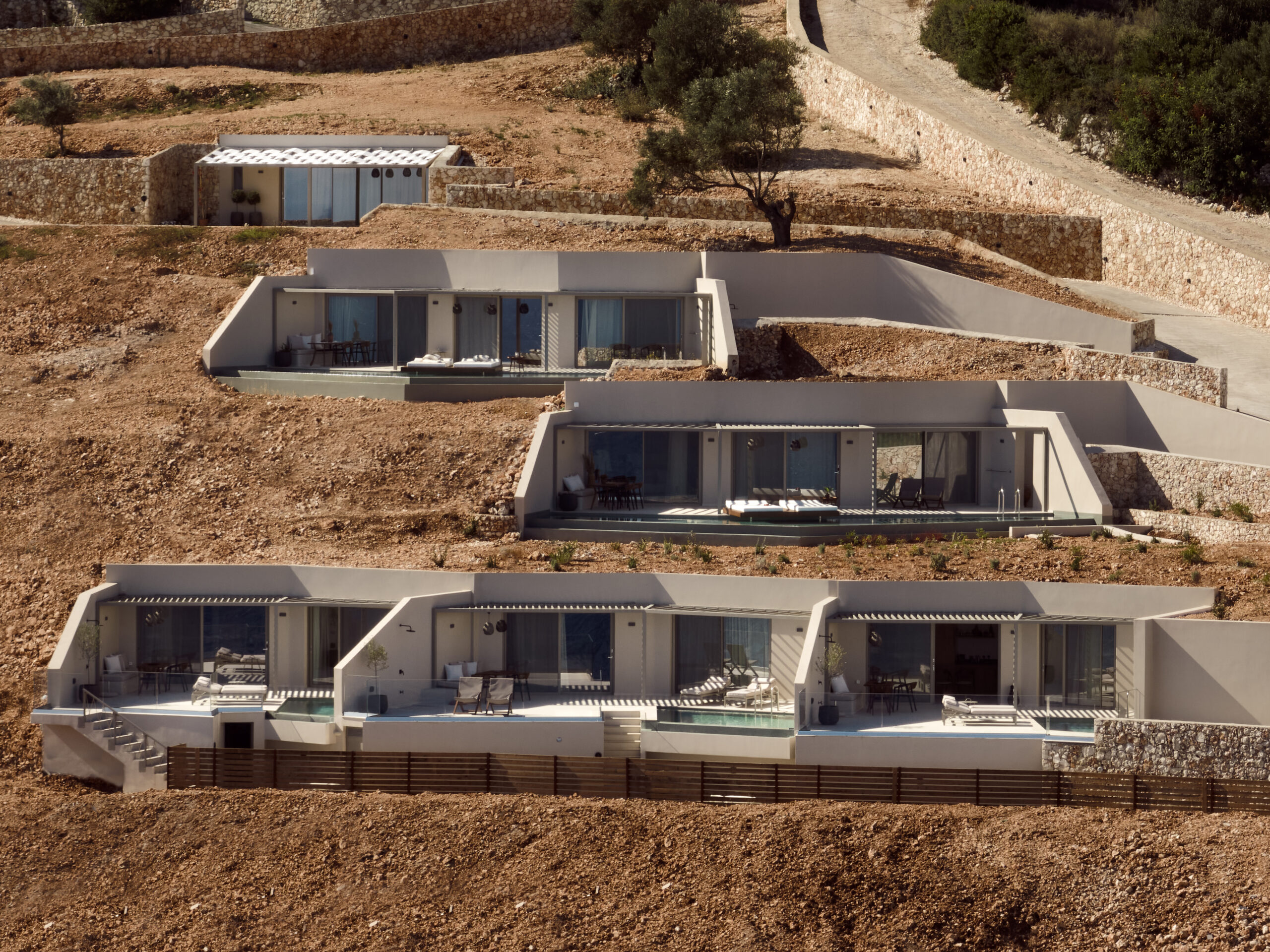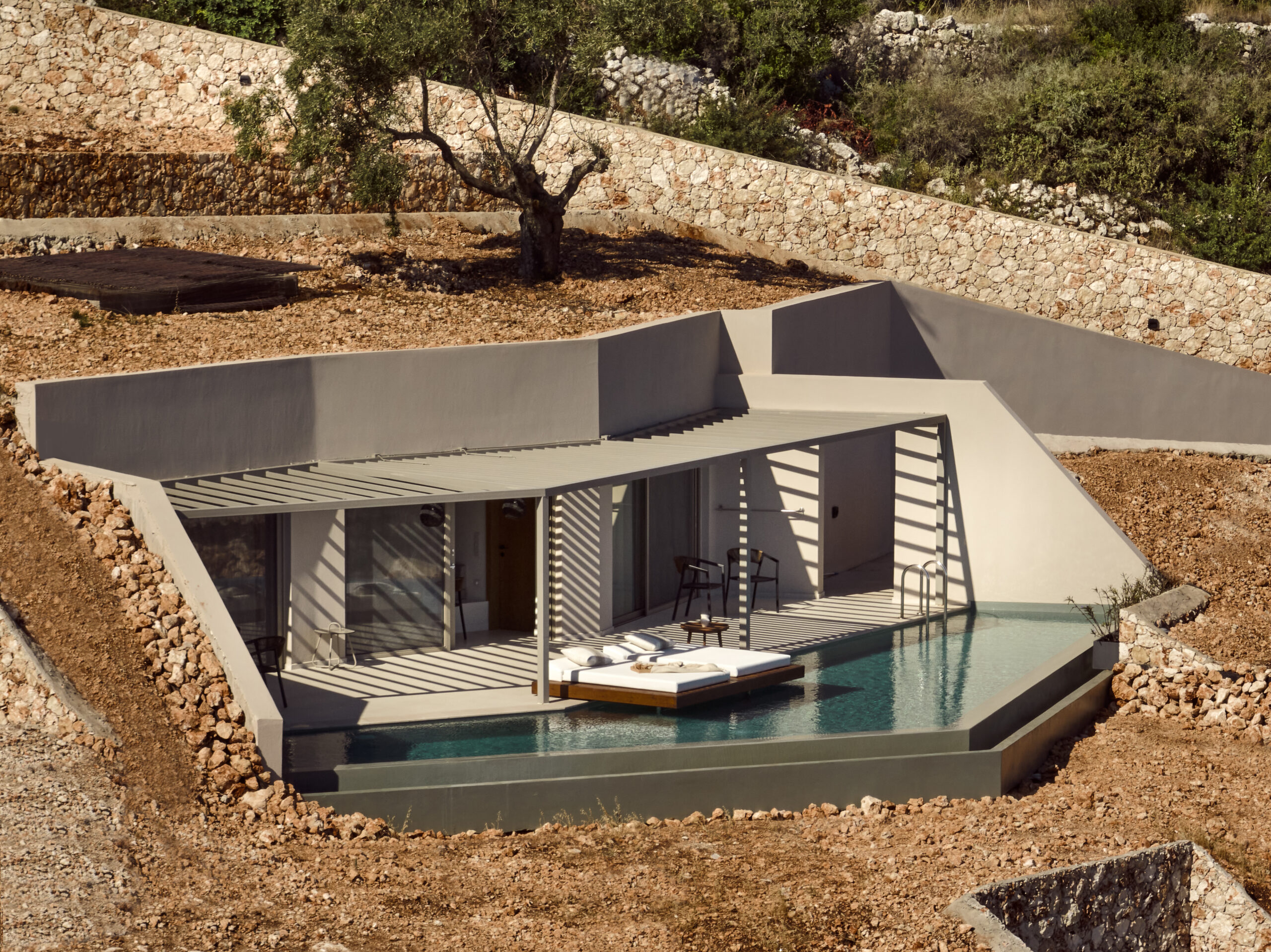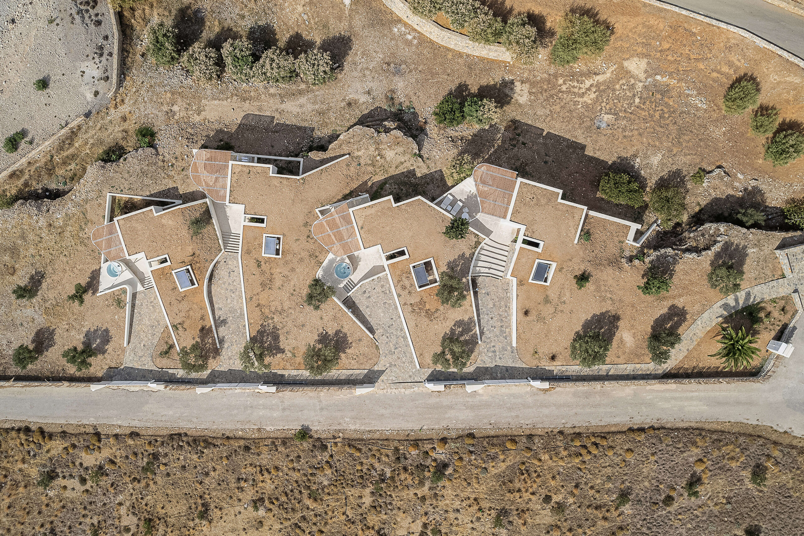 Cuatro pequeñas suites están ubicadas en el terreno accidentado del sur de Creta, inspirándose en los barrancos secos que conducen al mar. En lugar de colocar un solo edificio en el sitio, el diseño talla “valles” estrechos en la pendiente, cada uno de los cuales esconde una suite.