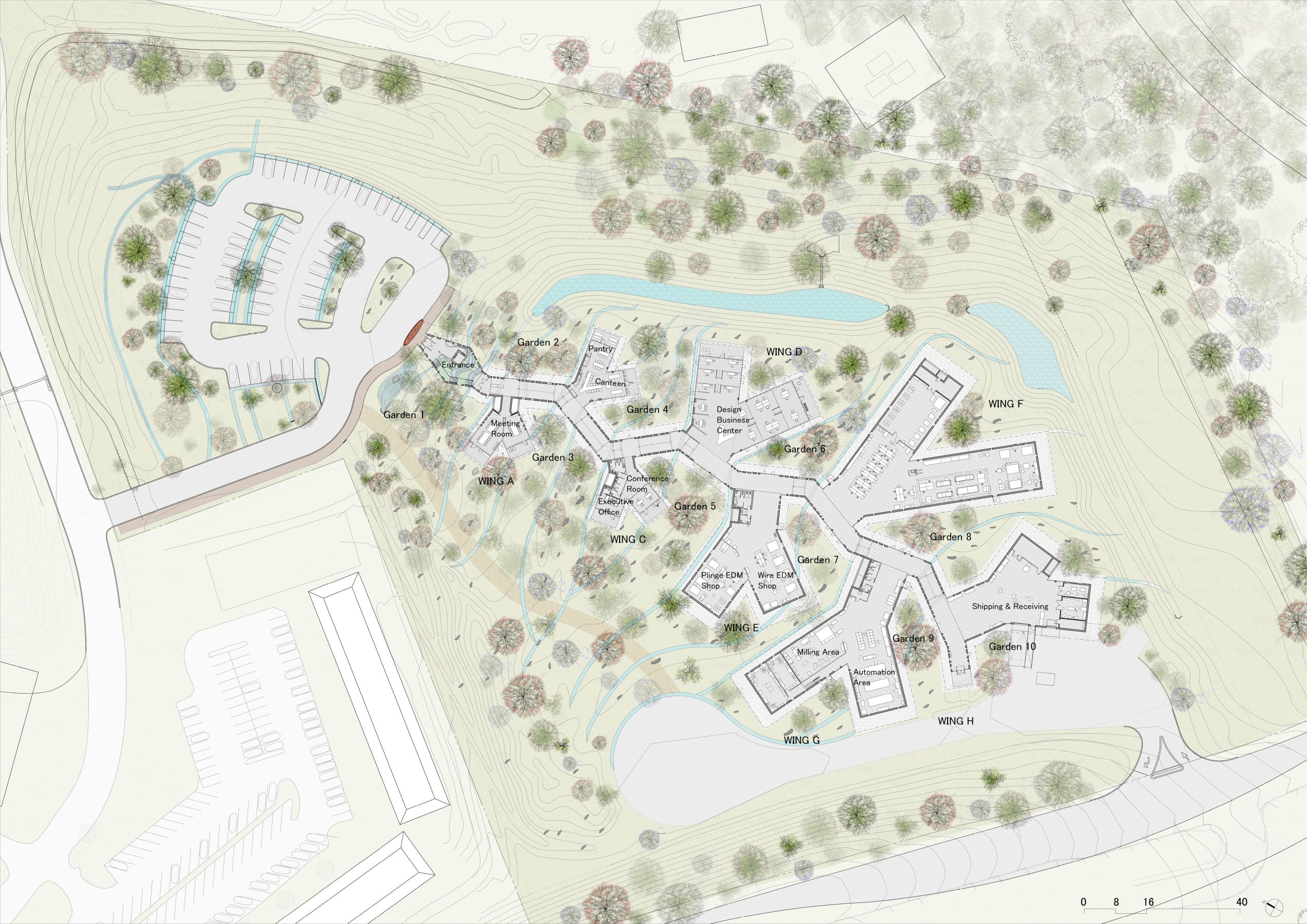 Los espacios entre las alas están llenos de jardines, lo que aporta vistas y luz natural al lugar de trabajo. A medida que el edificio se expande en el sitio, el plan sigue la pendiente y se mezcla con el paisaje. Las estructuras de madera enmarcan el interior, mientras que las columnas de abeto Douglas, las superficies de ciprés y los pisos de concreto dan forma al espacio cálido y conectado con la tierra. En el exterior, los canales plantados recogen el agua de lluvia y crean pequeñas zonas verdes que suavizan los bordes de los edificios.