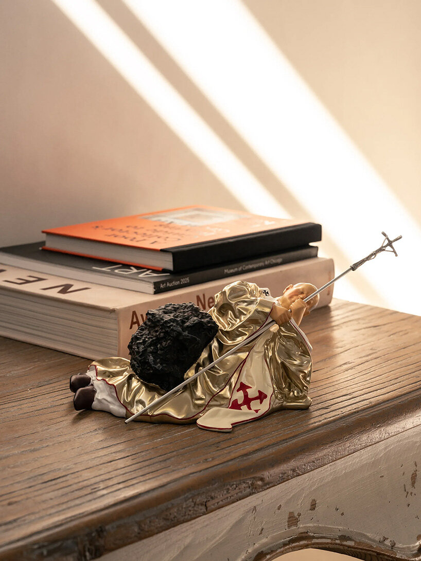 Junto a “La Nona Ola”, Mauricio Cattelan Revisando una de sus obras más controvertidas, traducida en 1999 Instalar Introduzca la nueva edición limitada escultura. La obra muestra al Papa Juan Pablo II congelado en el momento en que se desploma sobre una alfombra roja brillante después de ser alcanzado por un meteorito. Irreverente pero cuidadosamente compuesta, la obra conserva su tensión original y revela la fragilidad y humanidad de una poderosa figura religiosa.