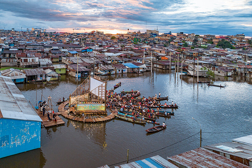en Belén, Perúel río Bangu repinta la ciudad cada año, Película Aparece como El espacio repetitivo de la vida colectiva. Desarrollado por la Asociación Espacio Común en colaboración con constructores locales cercanos, el escenario flotante de MuyunaFest tomó forma en el entorno anfibio de la Amazonía peruana. Aquí, las inundaciones estacionales de enero a junio convierten las calles en vías fluviales, reorganizando la vida cotidiana en torno a canoas, palafitos y estructuras flotantes. En este entorno cambiante, a largo plazo presión ambiental Con un apoyo estatal limitado, las medidas locales continúan manteniendo espacios para la educación, el encuentro y la producción cultural.