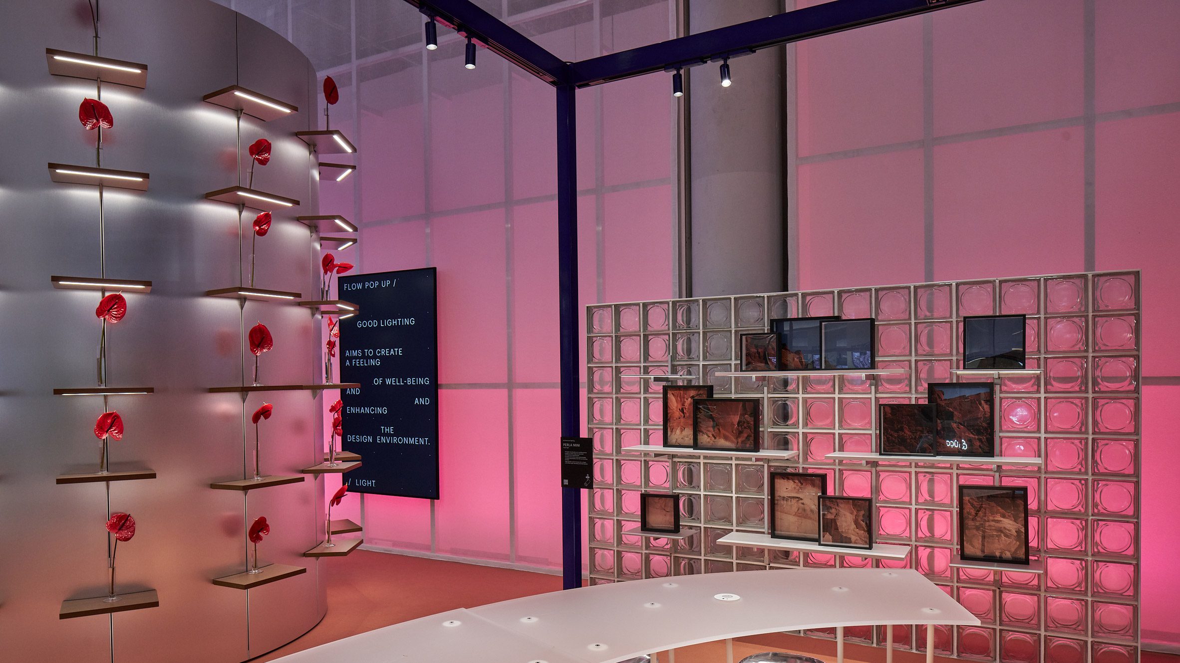 espacio Proporciona el pilar central del espacio, en el que se integran componentes digitales, exhibidores de productos y elementos de iluminación.