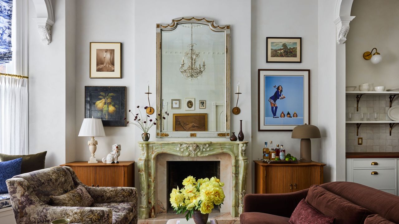 En Brooklyn, este sentimiento encontró un punto de apoyo. Weed imaginó el espíritu del hogar como una mujer del siglo XIX con un vestido largo, pero no particularmente feliz. Una renovación de mediados de siglo hizo que el apartamento de 1,100 pies cuadrados fuera más pequeño: techos claustrofóbicos, una cama alta y una humilde chimenea de ladrillo reemplazaron la alguna vez grandiosa repisa de mármol. “Si hubiera un fantasma viviendo en el apartamento”, dice, “me atrevería a suponer que esta elección de diseño la había perturbado mucho durante mucho tiempo y que le gustaría recuperar su antigua chimenea”.