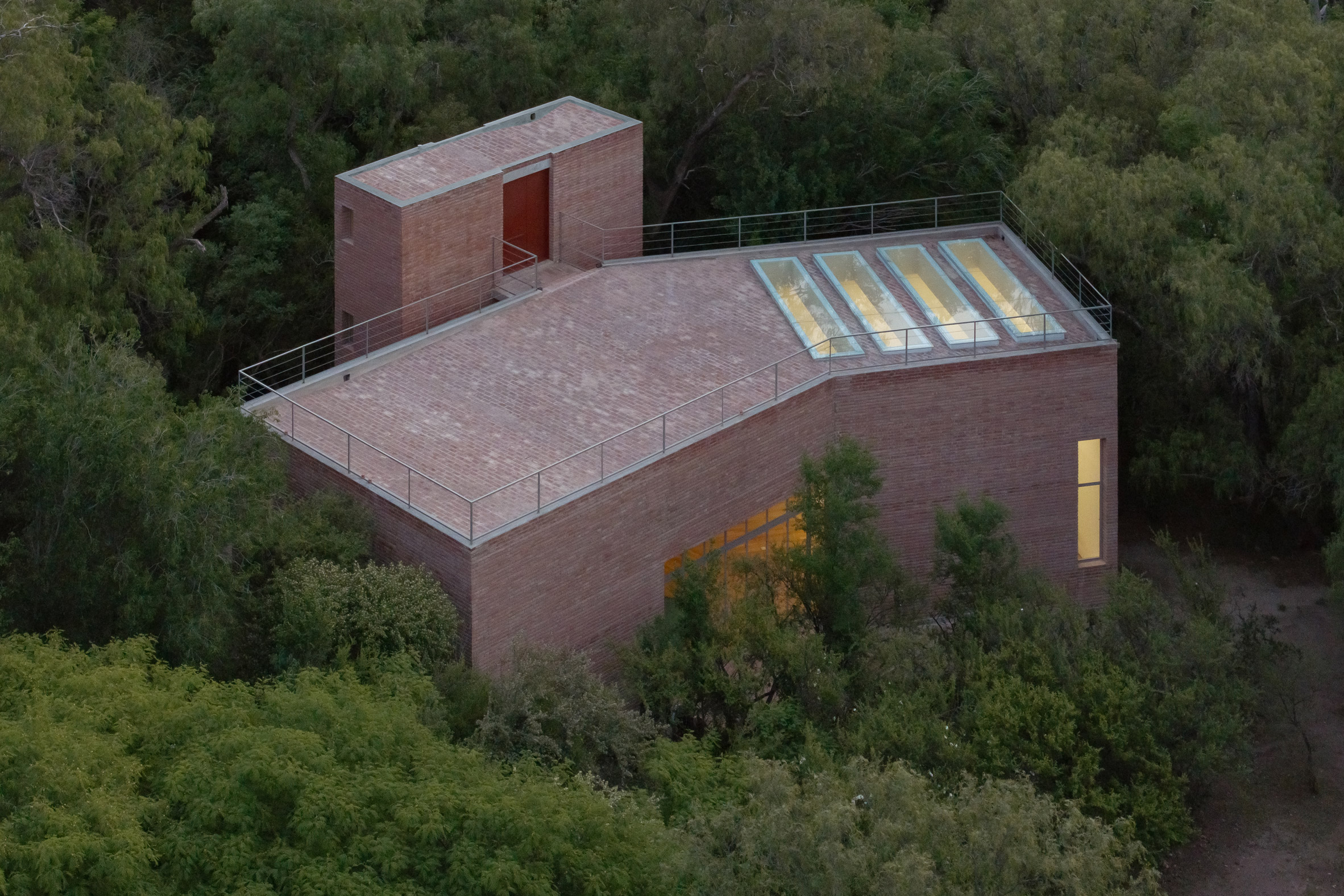 Ambos volúmenes presentan ladrillo rojo de origen local, una elección basada en la pequeña estructura que anteriormente se encontraba en el sitio y el deseo de mezclarse con el paisaje.