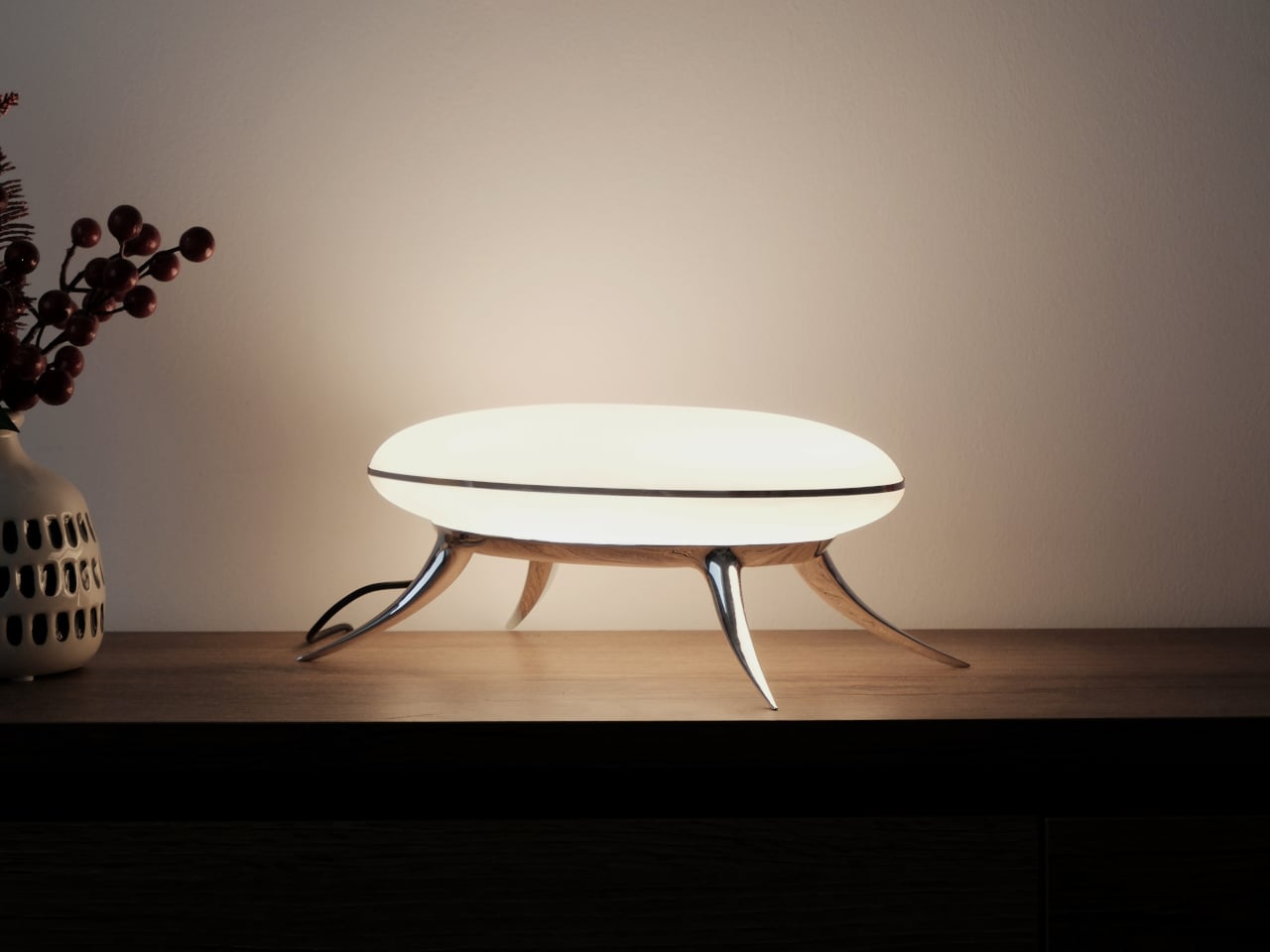 El cuerpo, hecho de bronce fundido con acabado cromado, está tallado en una postura baja y ancha sobre cuatro patas cónicas que se doblan y se abren en ángulos que hacen referencia a la biología más que a los muebles. Un conector de anillo de aluminio pulido en el centro mantiene el difusor de policarbonato mate en su lugar, y un disco LED integrado en su interior proyecta una luz cálida, suave y cerrada sobre la superficie debajo de él.