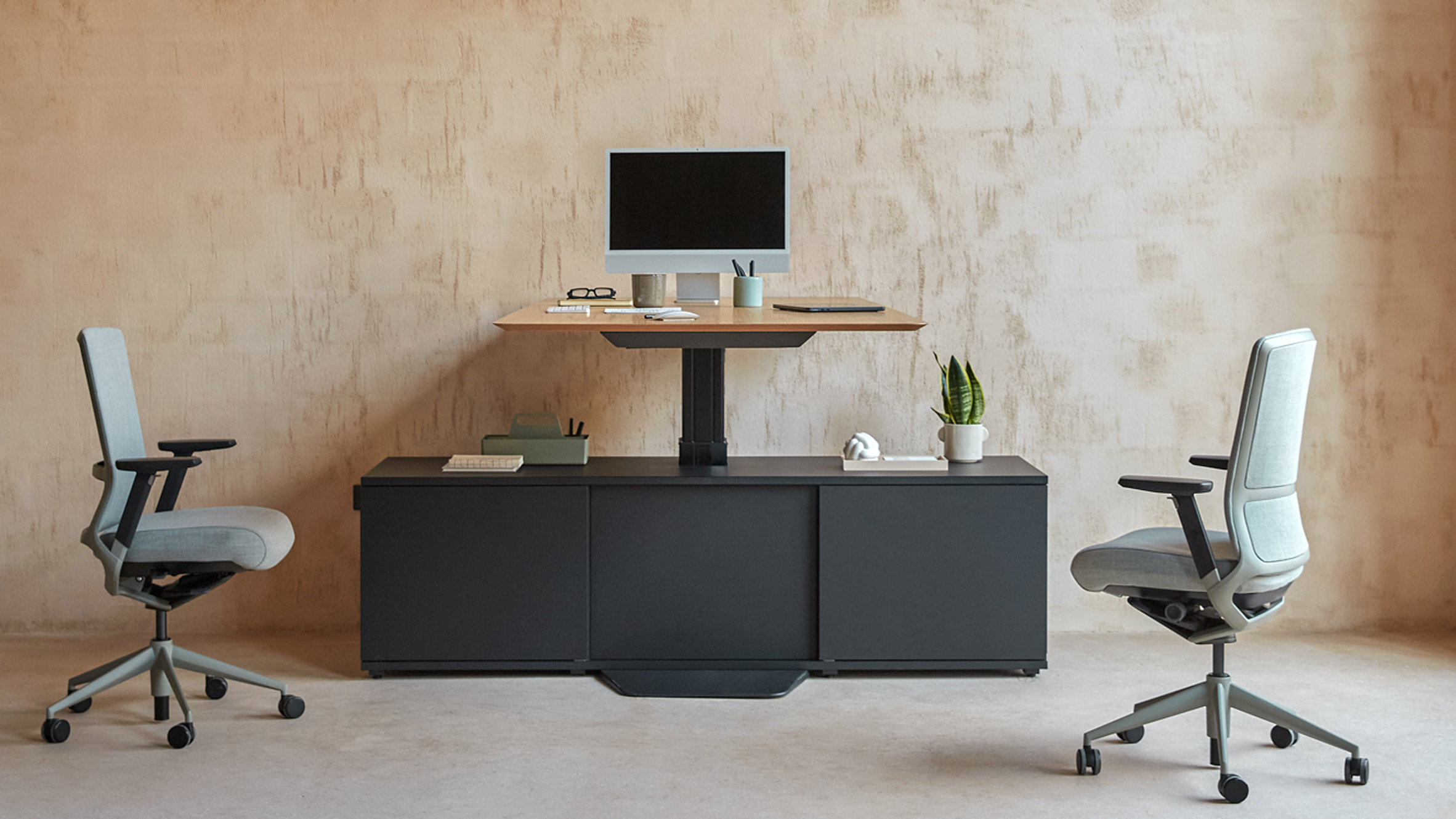 “Al concentrar los componentes mecánicos en una sola columna lateral, el diseño elimina las configuraciones tradicionales de centro o de dos patas, creando un espectacular efecto de voladizo que maximiza el espacio de trabajo utilizable y proporciona una huella sin obstáculos debajo del escritorio”.