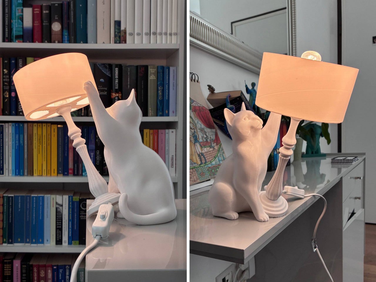 La clásica columna giratoria y pantalla de tambor, impresa en PLA en blanco, parece una lámpara adecuada, con el gato sentado a su lado, con una pata alcanzando la columna y la cabeza hacia arriba, congelado en esa mirada felina especial de travesura concentrada que todo dueño de gato reconocerá al instante. Las líneas superpuestas de la impresión se disuelven en la textura de la superficie en esta proporción, dando al objeto entero una calidad casi cerámica. Se coloca sobre una mesa o mesita de noche, y cualquiera que pase por allí podrá echarle un segundo vistazo.