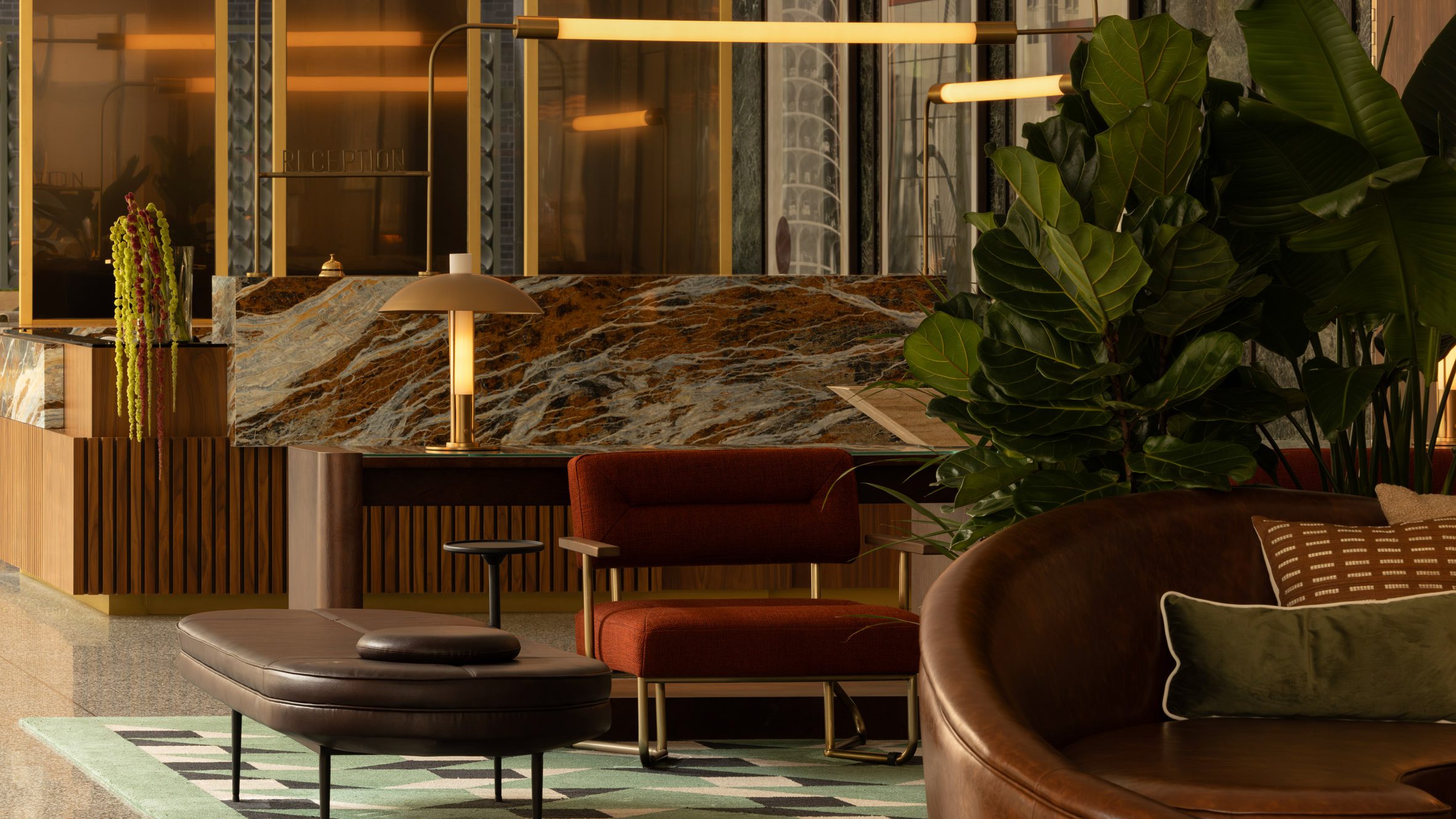 Elementos como paneles de madera retroiluminados, colgantes de latón y accesorios lineales enfatizan las proporciones del edificio, mientras que los muebles y patrones geométricos hacen referencia al trabajo de diseñadores italianos como Gio Ponti y Ettore Sottsass.