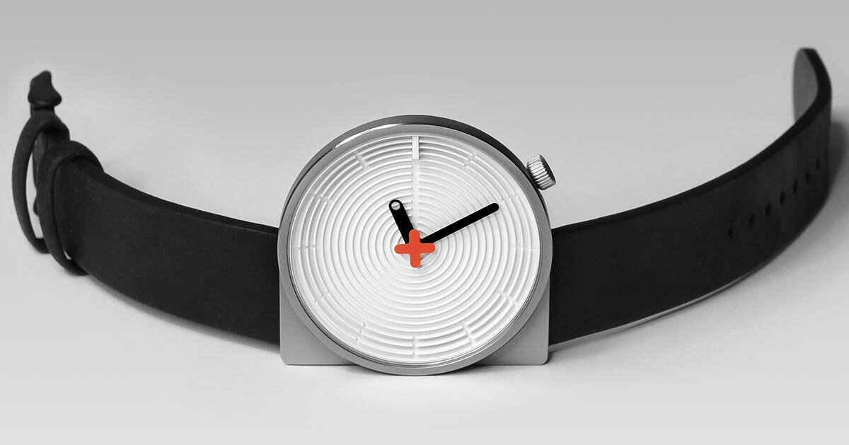 La caja consta de un conjunto apilado de sólidos de acero inoxidable pulido con chorro de arena: un frente redondo que alberga todas las funciones del reloj y una parte trasera rectangular que contiene asas integradas para sujetarlo a una correa de cuero negro. Las dos partes se mueven entre sí a través del mismo mecanismo de clic utilizado en los biseles giratorios de los relojes, lo que brinda a la acción de giro una sensación satisfactoria al hacer clic en cada marca de minuto. En marcado contraste con su apariencia minimalista, el reloj muestra una esfera escultórica con anillos elevados y ranuras que aprovechan al máximo el espacio interior. No hay carteles ni logotipos pegados o impresos que estropeen el “Jardín Zen”, cuyos espacios sombreados y tallados sirven como marcadores de hora. Al mismo tiempo, el logotipo “+” del bien y del mal flota arriba como el segundero.