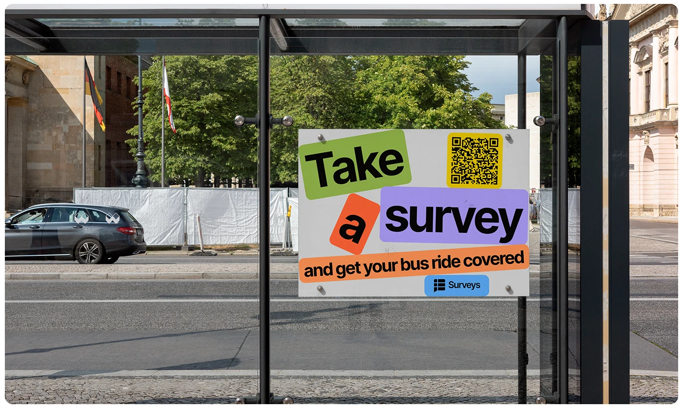 Lo que distingue la dirección visual es su fondo azul marino profundo, casi medianoche, iluminado por tonos degradados de verde azulado y cian. Este no es el típico lienzo en blanco que se encuentra en las herramientas de encuestas. La base oscura hace que los elementos iluminados de la tarjeta se sientan enfocados y premium, dirigiendo la mirada a la acción en pantalla. El frente de la tarjeta de la encuesta tiene un tipo legible, tiempo estimado de finalización y números de ingresos claros: todo lo que el usuario necesita para tomar una decisión en tres segundos.