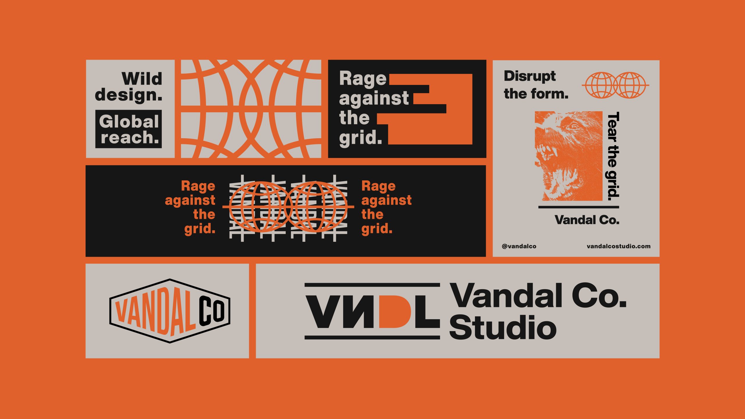 El lenguaje visual se centra en el naranja eléctrico y los negros y blanquecinos prístinos. El logotipo de la insignia de diamante personalizado presenta “VANDAL Co.” El nombre tiene una forma de letra clara y comprimida. La variante de marca de texto lo reduce a “VNDL” con un espacio negativo de alto contraste. Ambas marcas son claramente visibles desde lejos.