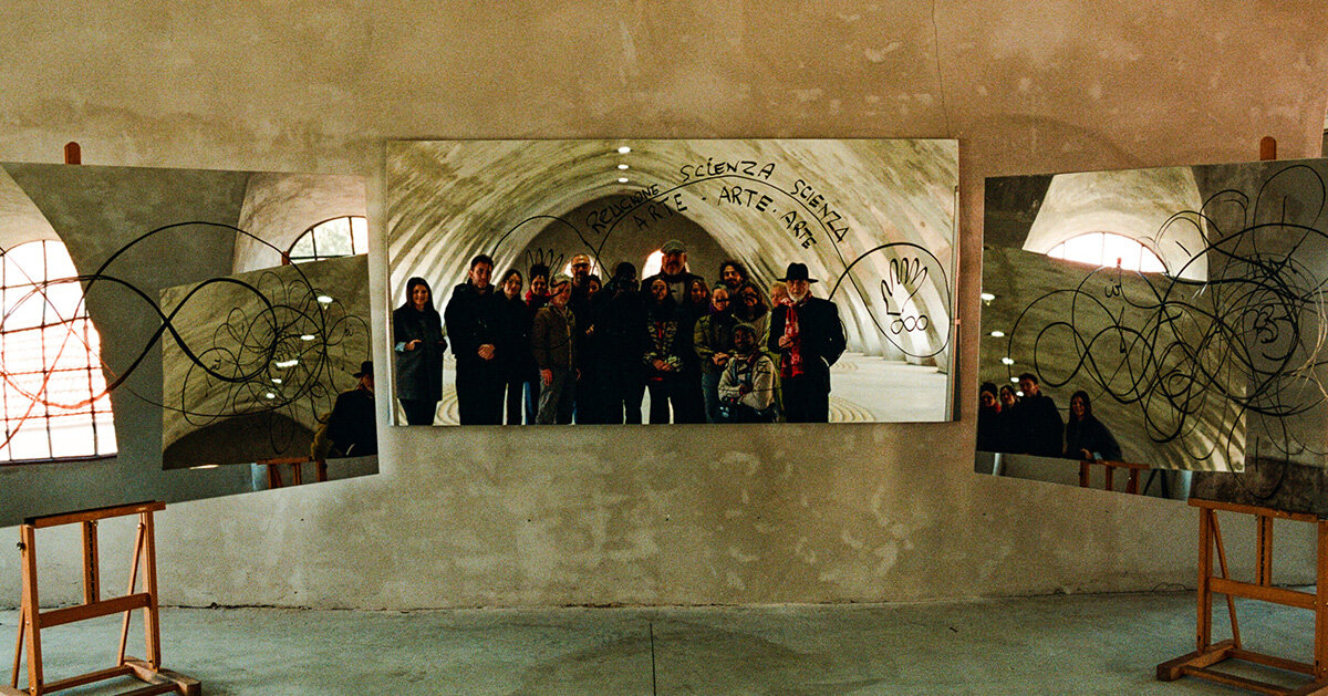 Three Mirrors está estructurado como un tríptico, tercer cielo, fórmula de creación y estado de nación, desarrollado a través de una serie de gestos simples hasta convertirse en un sistema conceptual más amplio. En Third Heaven, el familiar símbolo del infinito se interrumpe, creando un tercer círculo entre dos fuerzas opuestas y proponiendo un espacio equilibrado entre los mundos natural y artificial. Esta idea se desarrolla en la Fórmula de la Creación, donde la relación se vuelve explícita a través de la ecuación 1+1=3, indicando que el encuentro entre “yo” y “tú” crea un “nosotros” colectivo. Cuando la obra llega al Statodellarte, esta lógica pasa al ámbito cívico, donde la creatividad ya no es vista como un acto individual, sino como una condición social compartida inseparable de la responsabilidad.