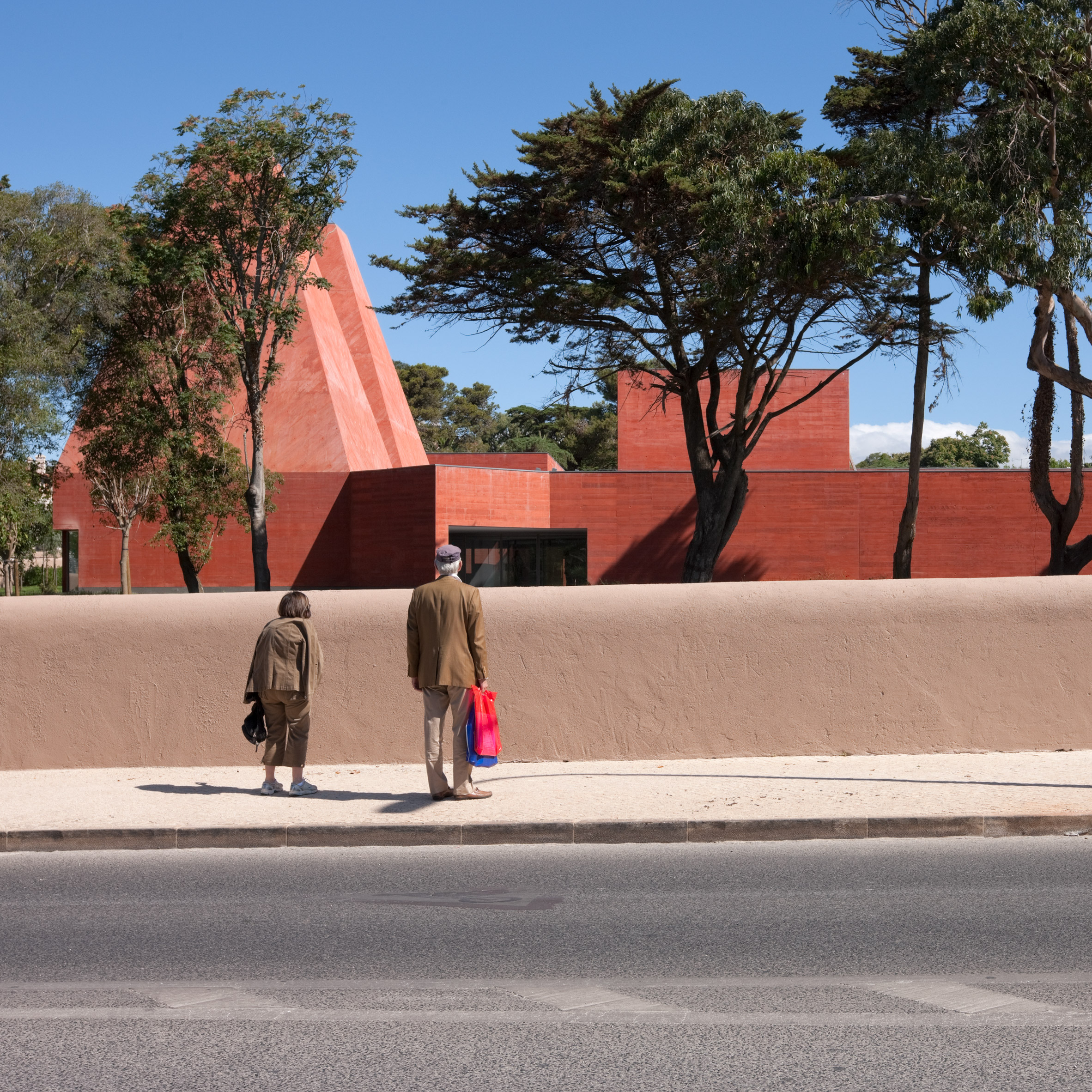 El edificio es muy profundo. hormigón rojo Fue elegido para contrastar con la vegetación circundante y hacer referencia a la obra del arquitecto portugués Raúl Lino.