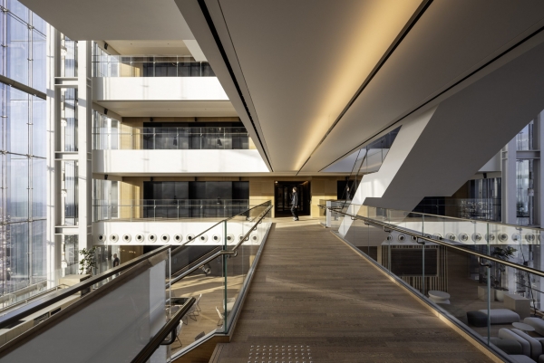 Los ascensores miran hacia el atrio central en lugar de hacia el típico núcleo de servicios, transformando la circulación vertical diaria en una experiencia espacial.