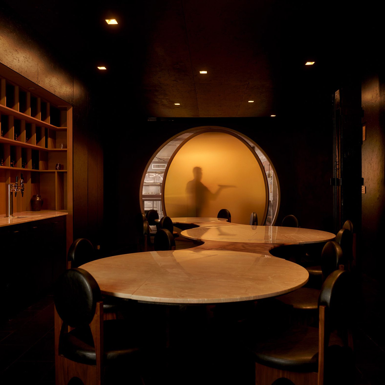 En marcado contraste con la sensación oscura del comedor principal, una puerta pivotante circular de vidrio amarillo translúcido termina el espacio.