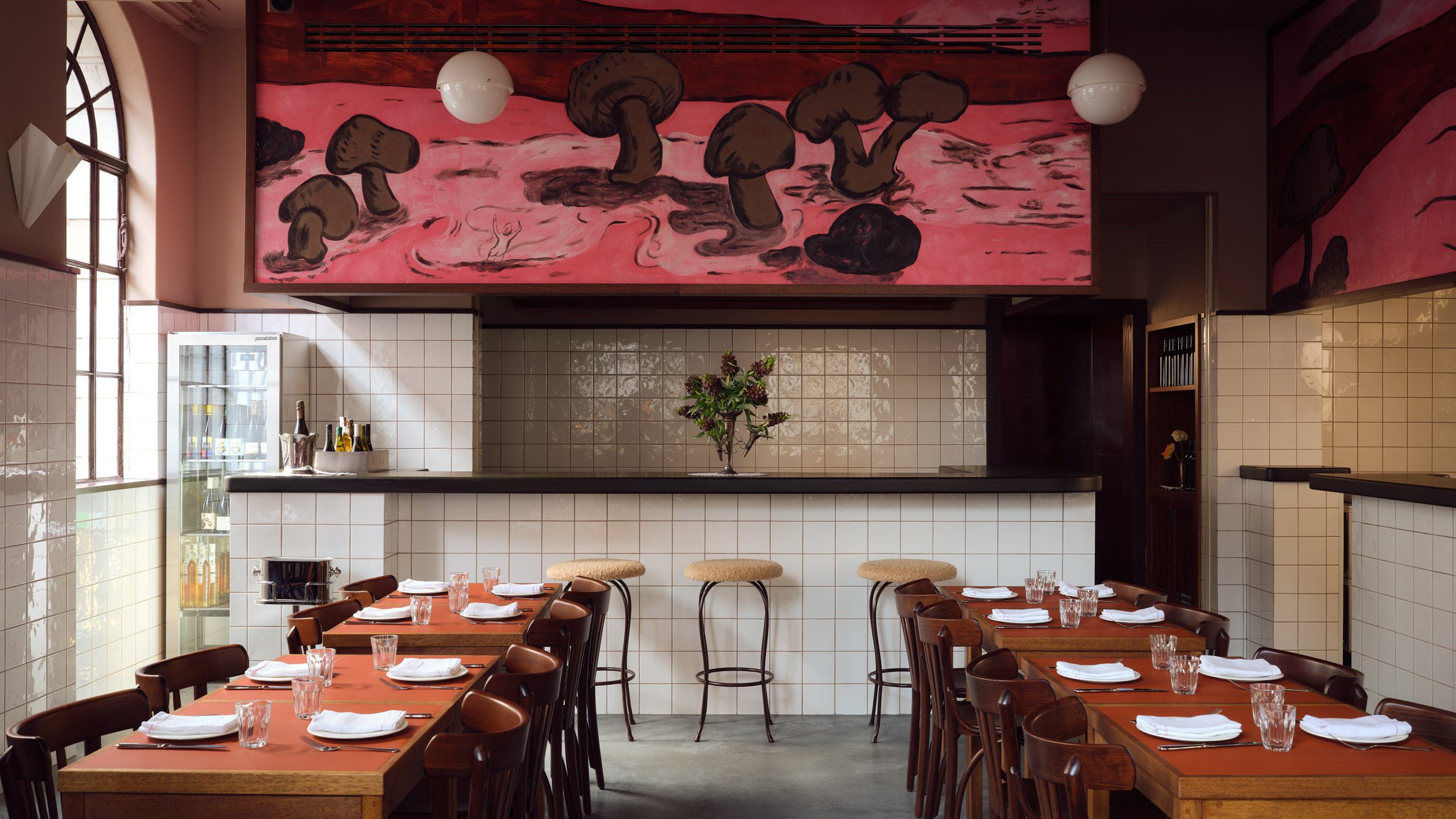 Toogood cuelga un cuadro pintado a mano. mural Encima de la barra se representa un paisaje sobrenatural de setas de color marrón rosado.