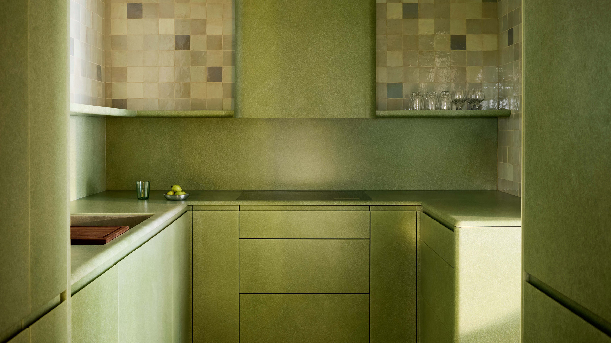 La estufa, el refrigerador y el lavavajillas están ocultos detrás de paneles, mientras que el protector contra salpicaduras tiene un acabado en azulejos marroquíes multitonales en verde mar.