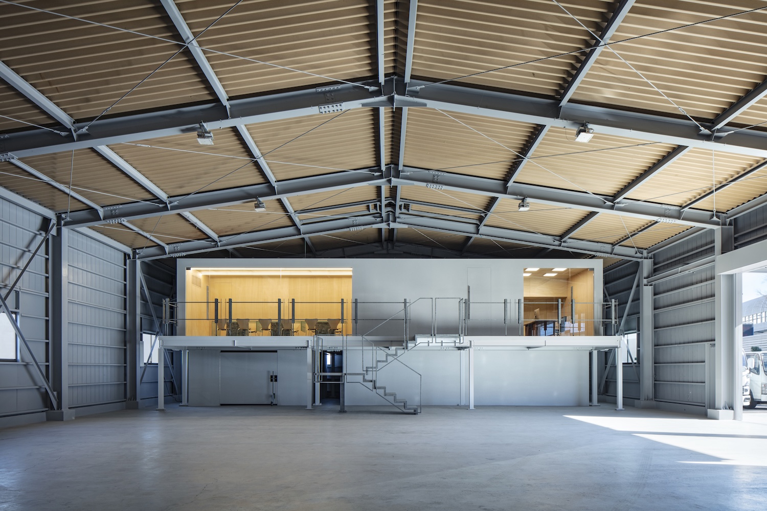 El volumen acristalado del segundo piso alberga la oficina del presidente y la sala de conferencias, manteniendo la conectividad visual en todo el espacio. Las paredes y techos de madera dentro de estos recintos contrastan con los tonos grises predominantes en la fábrica, un contraste material que funciona a través de la temperatura más que del color, del mismo modo que los interiores de Hiroshi Nakamura utilizan la madera para humanizar las estructuras utilitarias. Este efecto atrae la atención hacia arriba, con mesas y estantes únicos que actúan como anclajes visuales, atrayendo a los visitantes al segundo piso.