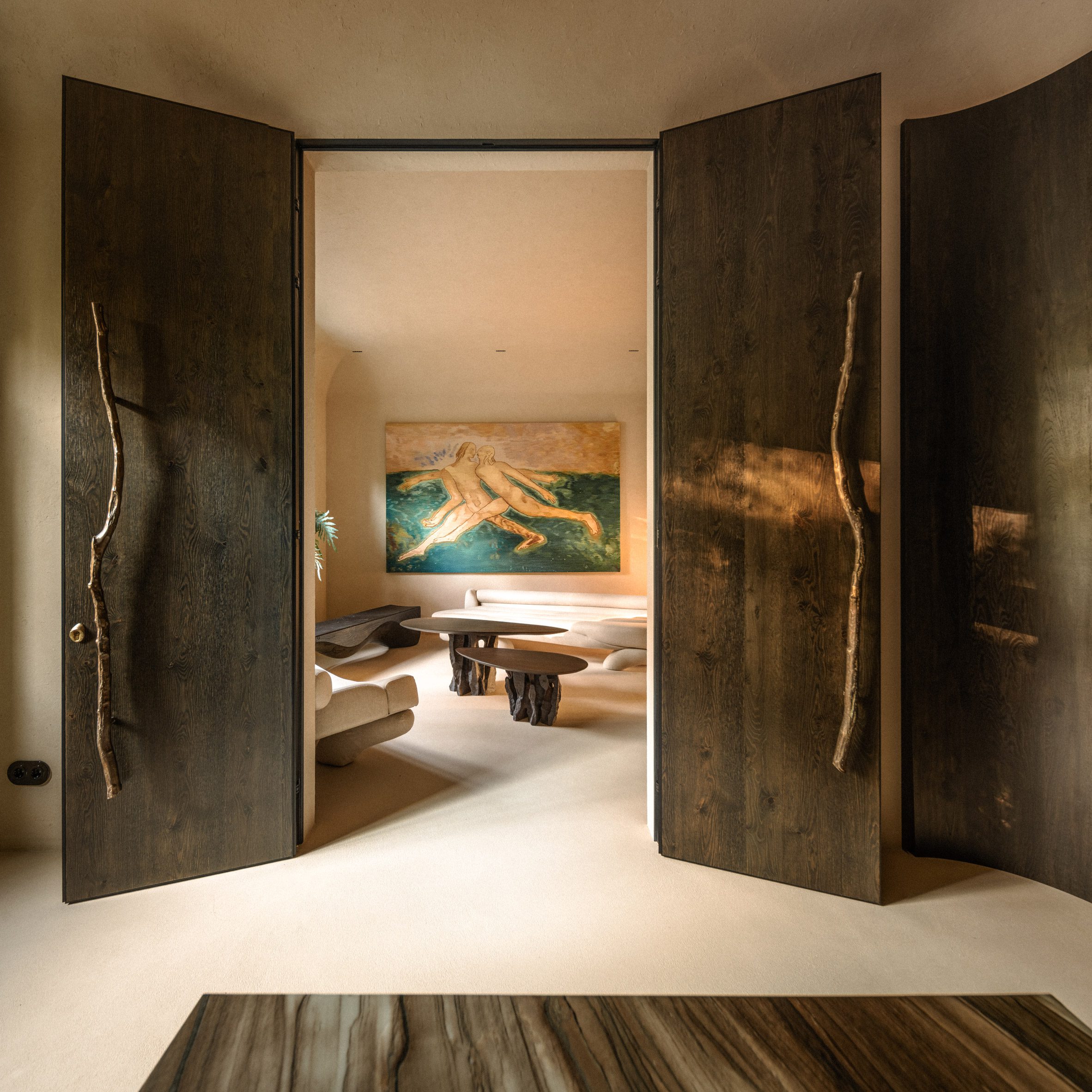 Los asientos esculturales de la marca italiana Riva 1920 están hechos de madera maciza recuperada y brindan espacio adicional para sentarse y admirar al artista cerámico. Yuri Sulikovskyesculturas totémicas y tapices murales diseñados por Sukholit.