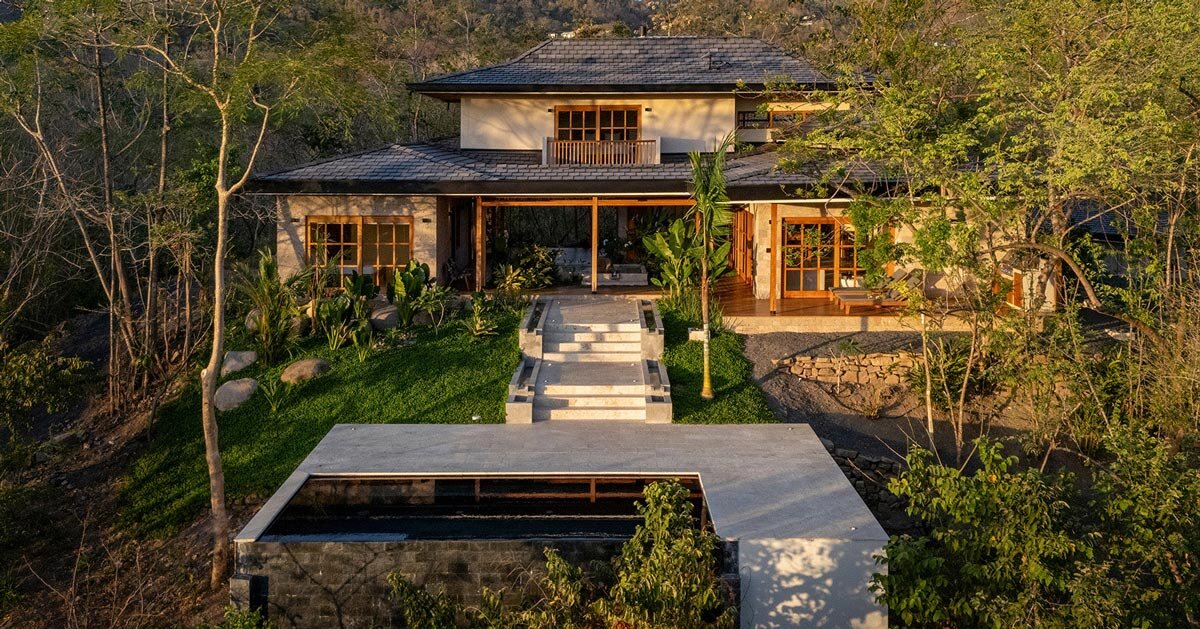 Casa Milagros, ubicada en Nosara, Costa Ricaes un Residencial El proyecto de Garton Group Architecture combina principios arquitectónicos tropicales con métodos de construcción contemporáneos. El diseño incorpora reciclado océano-plástico techo baldosas de cerámica, naturales piedra revestimiento, expuesto madera Los elementos de agua estructurales y continuos sirven como parte de una estrategia material arraigada en los recursos locales y las condiciones ambientales.