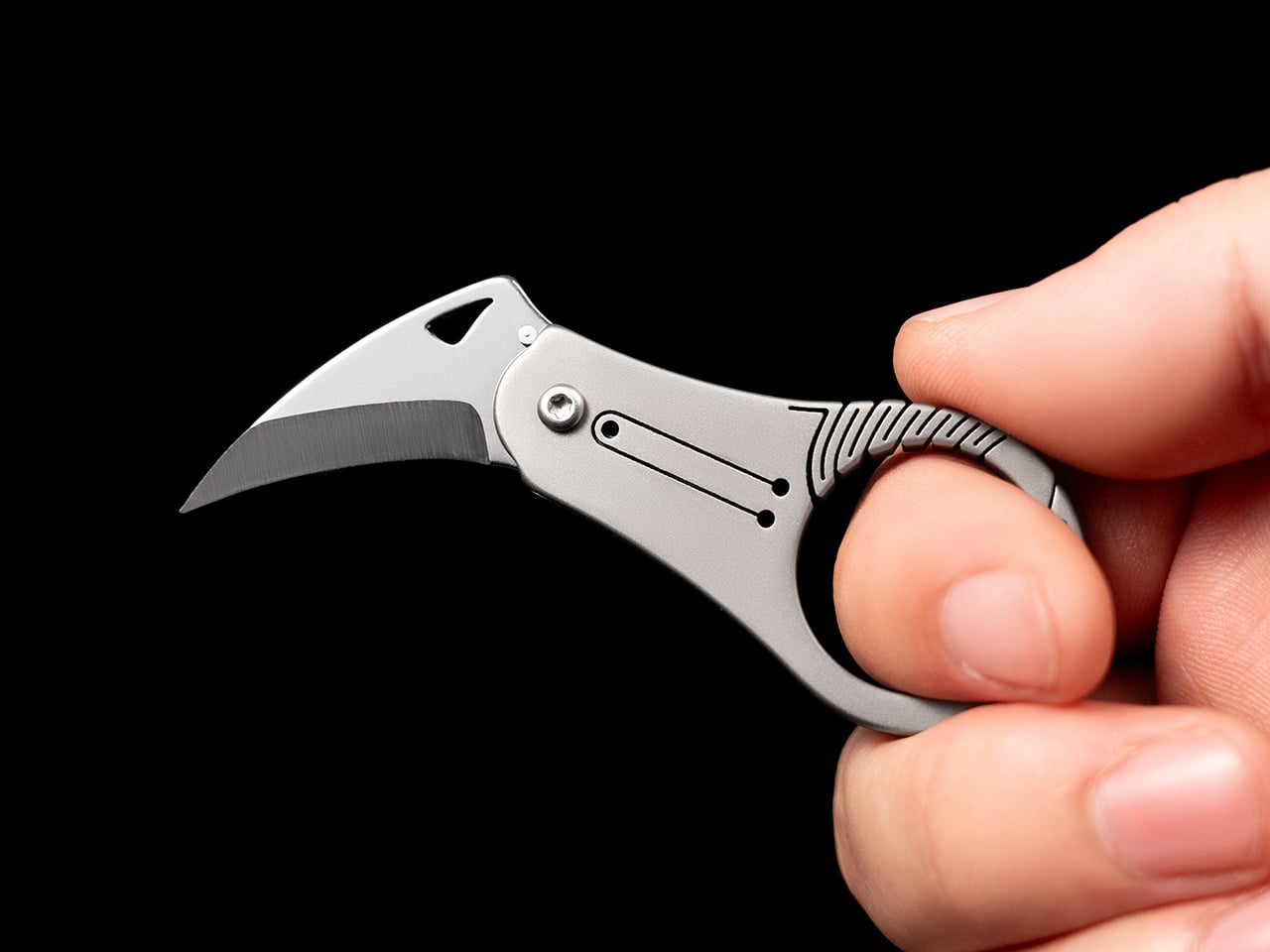 Las águilas no serán derribadas por la fuerza. Agarran con precisión, usando sus garras curvas para guiar naturalmente a sus presas hacia un camino cortante mientras la curvatura de las garras hace el trabajo. Esta geometría se ha demostrado en herramientas de recolección, cuchillos para aparejos marinos y trabajos con cuerdas durante siglos, pero el mercado de EDC siempre ha optado por hojas rectas que requieren presión hacia abajo en lugar de utilizar movimientos naturales de la mano. Una hoja curva facilita el corte, agarra materiales flexibles sin deslizarse y concentra la fuerza en el punto de contacto que una regla no puede replicar. Este factor de forma existe en kalambits y careyes, pero estas herramientas tienden a ser agresivas, de gran tamaño y diseñadas para un uso intensivo en lugar de llevarlas con un llavero.