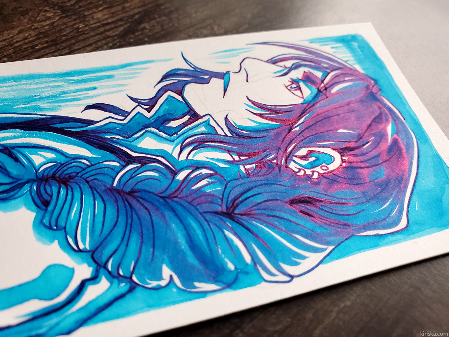 Para este, dejé que la tinta de línea se secara completamente durante la noche y luego apliqué tinta adicional. Nuevamente, usar un pincel con tinta resultó en cero brillo, así que también usé una barra de muestra para agregar más tinta al cabello. Esto logró el efecto que quería, lo cual es especialmente bueno considerando que está en papel tipo Bristol en lugar de papel de planificación más delgado y apto para bolígrafos.