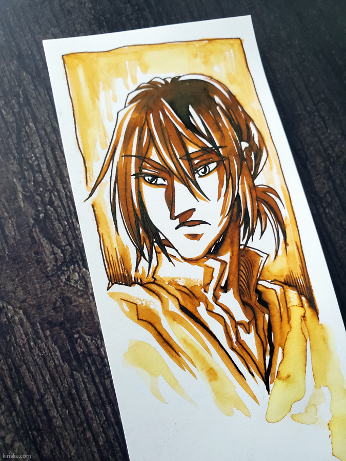 El brillo verde de la tinta Birmingham Amber es mucho más sutil en general en comparación con el Vinta Kosmos, pero finalmente logré que se viera el brillo en la tinta que apliqué con un pincel (era un mechón en el cabello)… solo era necesario mucho La tinta del pincel debe diluirse lo menos posible con el agua que ya está en el pincel.