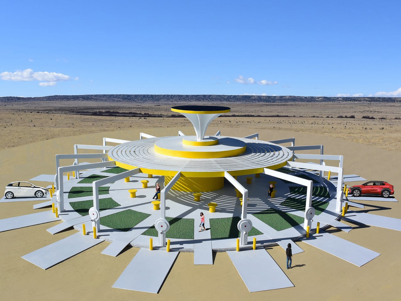 Los 16 puntos de carga están distribuidos simétricamente alrededor del perímetro de la instalación, cada uno marcado con una base de hormigón, un par de parachoques de seguridad amarillos y una base de carga exclusiva. Los pasillos conectan cada sitio hacia el interior con el centro, pasando a través de parches alternos de césped verde artificial, creando un contraste sutil pero deliberado con el paisaje circundante. Es un recordatorio de que el diseño está pensado para algo más que cargar el coche.