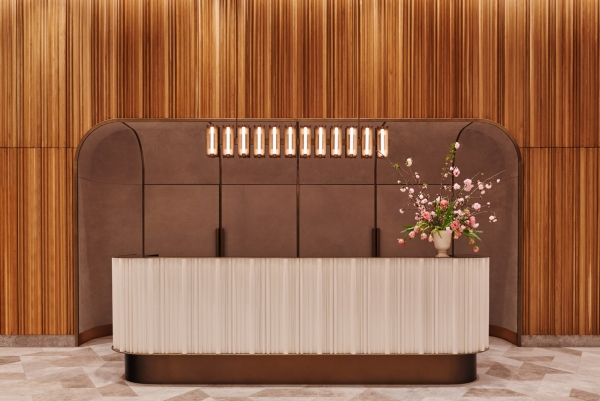 El vestíbulo revestido de roble blanco de 6000 pies cuadrados constituye el espacio principal de llegada para residentes e invitados. El diseño interior hace referencia al histórico Dime Savings Bank de al lado al tiempo que presenta características residenciales cálidas.