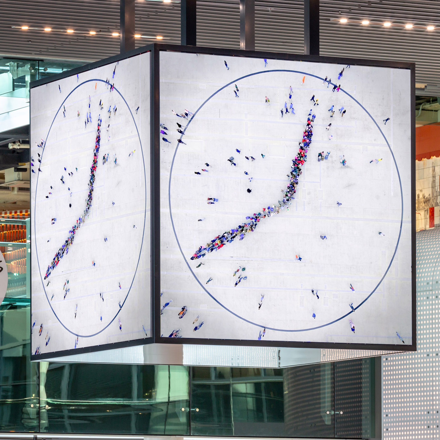 El clip final se muestra en cuatro pantallas dispuestas alrededor de un cubo de 250 x 250 x 250 cm, creando una interesante representación del tiempo que pueden ver las decenas de millones de pasajeros que pasan por el aeropuerto de Schiphol cada año.