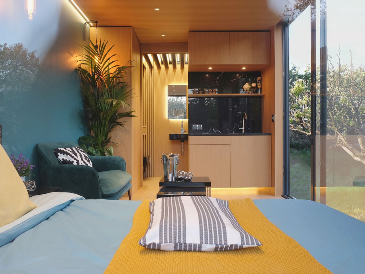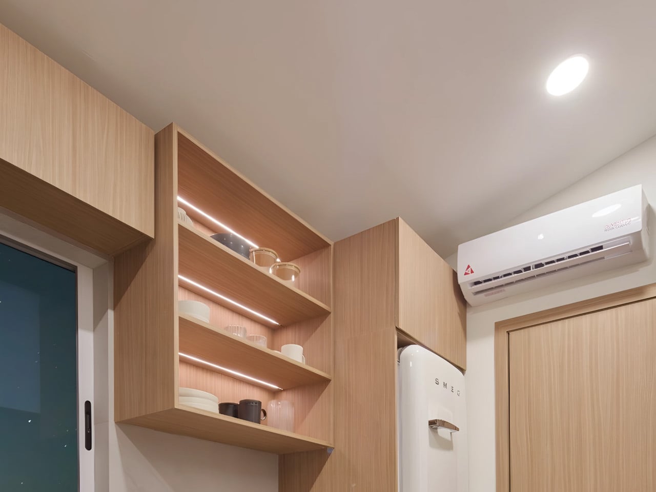 La distribución interior se define por una flexibilidad inteligente más que por un compromiso. El dormitorio funciona perfectamente como sala de estar, con una cama que se puede usar como asiento, estantes integrados para mantener la claridad visual y un televisor estratégicamente ubicado. Dos entradas separadas mejoran la circulación y la usabilidad, mientras que un porche cubierto amplía la vida diaria al aire libre. El almacenamiento oculto y la carpintería personalizada respaldan aún más el entorno ordenado, lo que demuestra que la calidad espacial está impulsada por la inteligencia del diseño y no por los metros cuadrados.