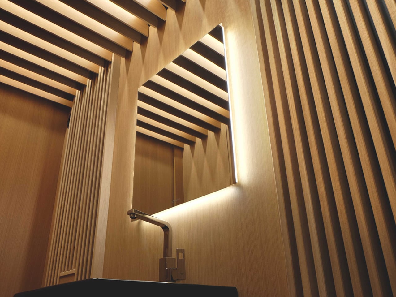La estrategia de vidrio vertical absorbe la luz natural cambiante y expande sutilmente los límites del espacio sin aumentar el área. Por la noche, la iluminación en capas se mezcla con la arquitectura a través de espacios empotrados y lavabos de nivel inferior. Este enfoque suaviza los bordes, reduce la fatiga visual y crea un suave ritmo de movimiento que permite que el espacio se despliegue gradualmente a través de la luz.