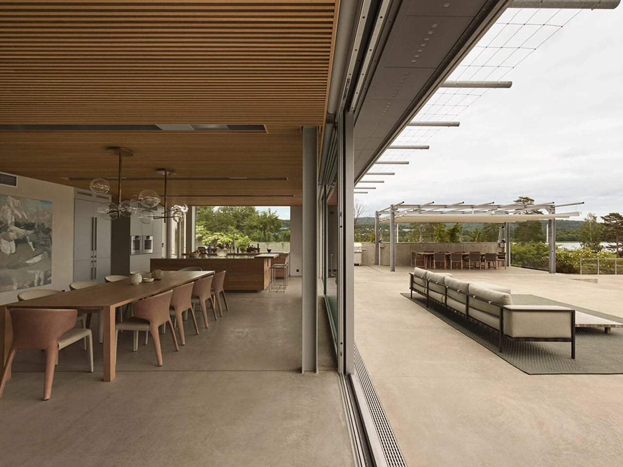 El espíritu de amar la vida impregna todo el interior, con espacios que fluyen a la perfección entre patios ajardinados, espacios de trabajo y zonas de estar. Las amplias paredes corredizas de vidrio borran los límites entre el interior y el exterior, ofreciendo vistas sin obstáculos del fiordo. Los tragaluces dispuestos a lo largo de un eje compartido conectan las habitaciones interiores con el techo vegetal de arriba, mientras que los materiales naturales como el cedro, el hormigón y el acero crean un diálogo táctil entre el entorno construido y la naturaleza.