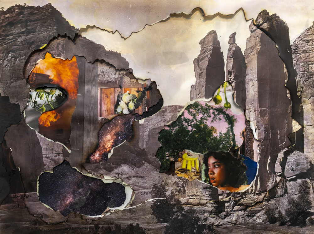 ©Naomi White, Time Enters Landscape, 2024 Fotografías originales y encontradas, impresiones con pigmentos de archivo, pegamento de archivo, fuego y cenizas 44×61”