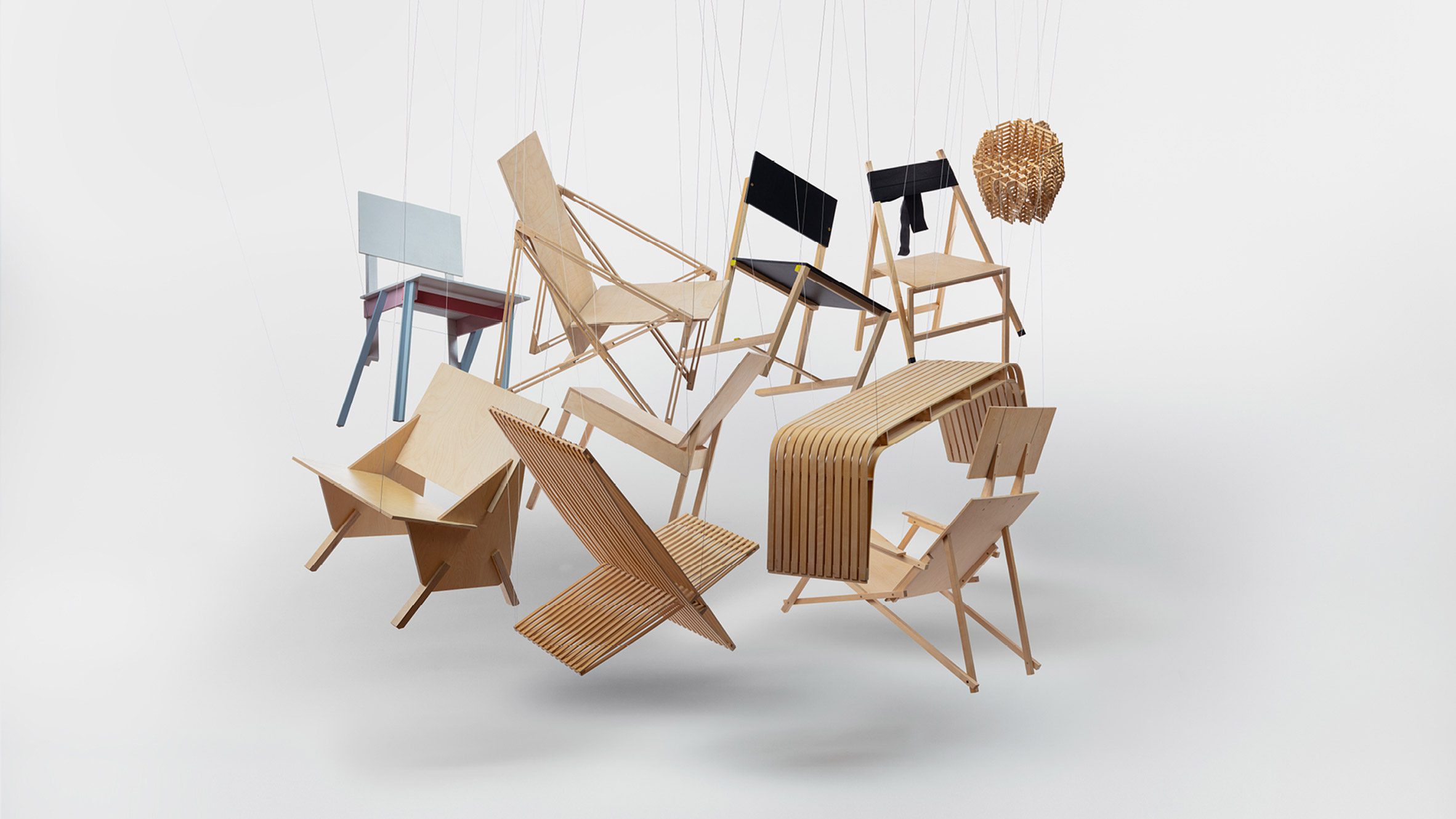 “En el taller anual de muebles para sentarse de la Academia de las Artes de Estonia (EKA), los estudiantes de primer año de arquitectura y arquitectura de interiores diseñaron y construyeron una silla funcional de tamaño completo utilizando sólo un conjunto limitado de palos precortados y madera contrachapada.