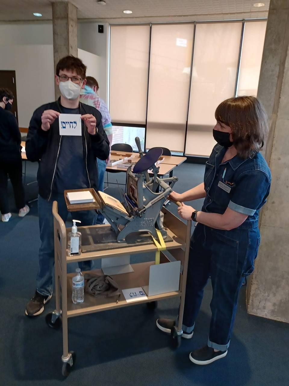 Amelia Hugill-Fontanel llevó una prensa de mesa a un evento en el campus del RIT. Aquí, “L’chaim” está impreso utilizando la serie antigua de tipos de madera hebrea de Cary.