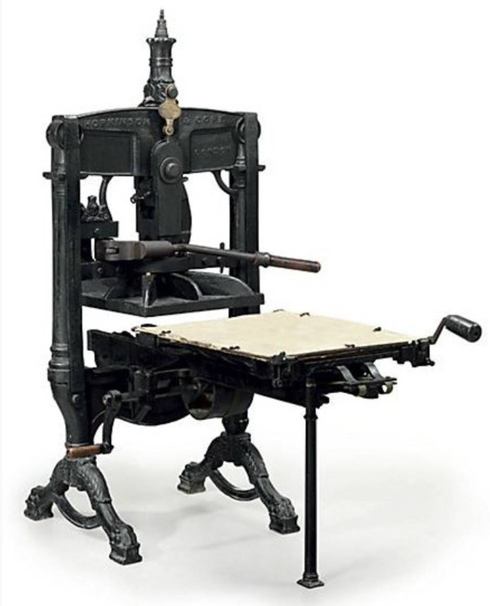 Albion Press No. 6551 “Kelmscott/Goudy Press” Construido por Hopkinson & Cope London, 1891. Comprado en 2013 por RIT Cary Collection.