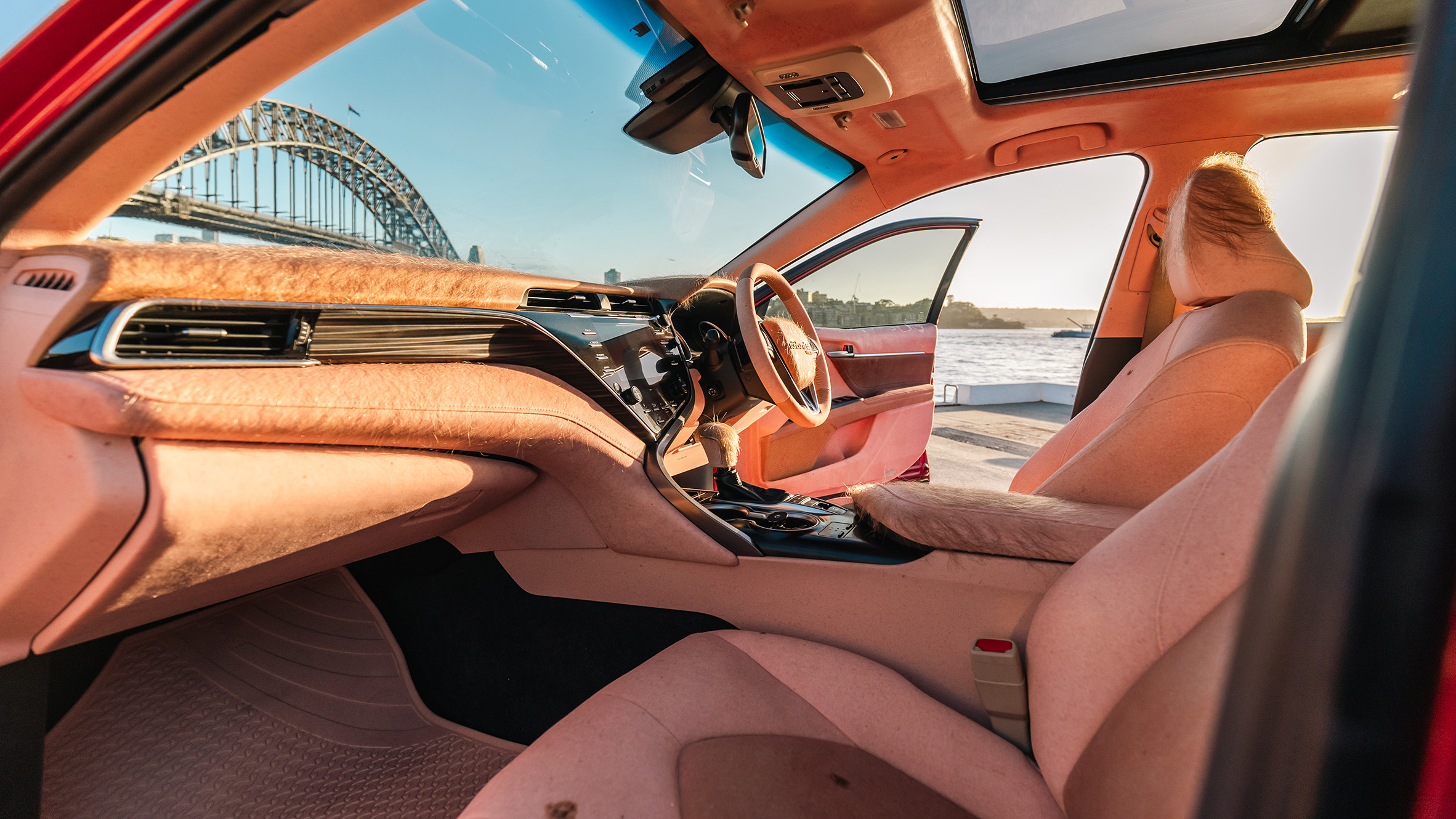 Diseñado para parecer extremadamente real, coche quemado por el sol Su tablero, paneles interiores y asientos están hechos de una “piel” de silicona con tinta que cambia de color y responde a los rayos UV.