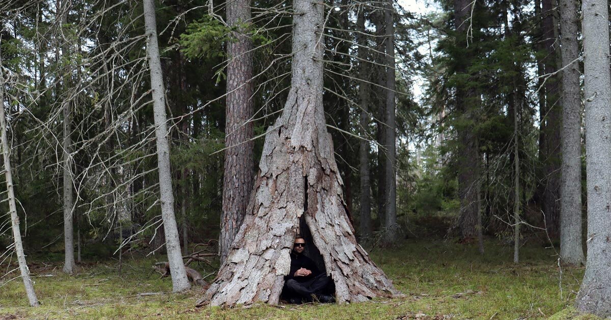 La cabaña de corteza de abeto de Ulf Mejergren crece alrededor de un árbol vivo en Suecia