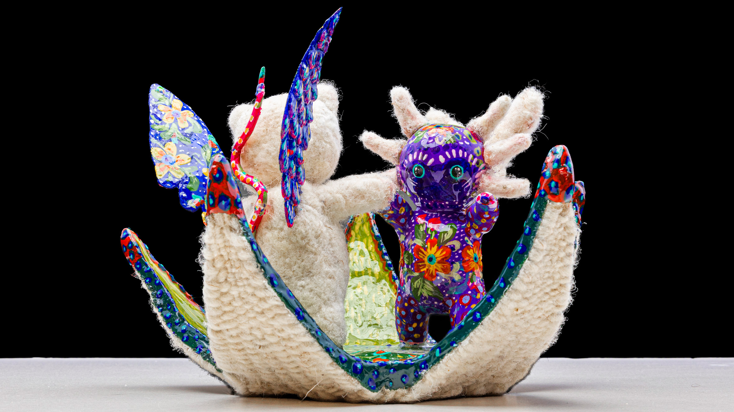 “Baila la Vida representa un matrimonio entre una salamandra inspirada en la Tlanchana de Metepec y una zarigüeya con alas de colibrí.