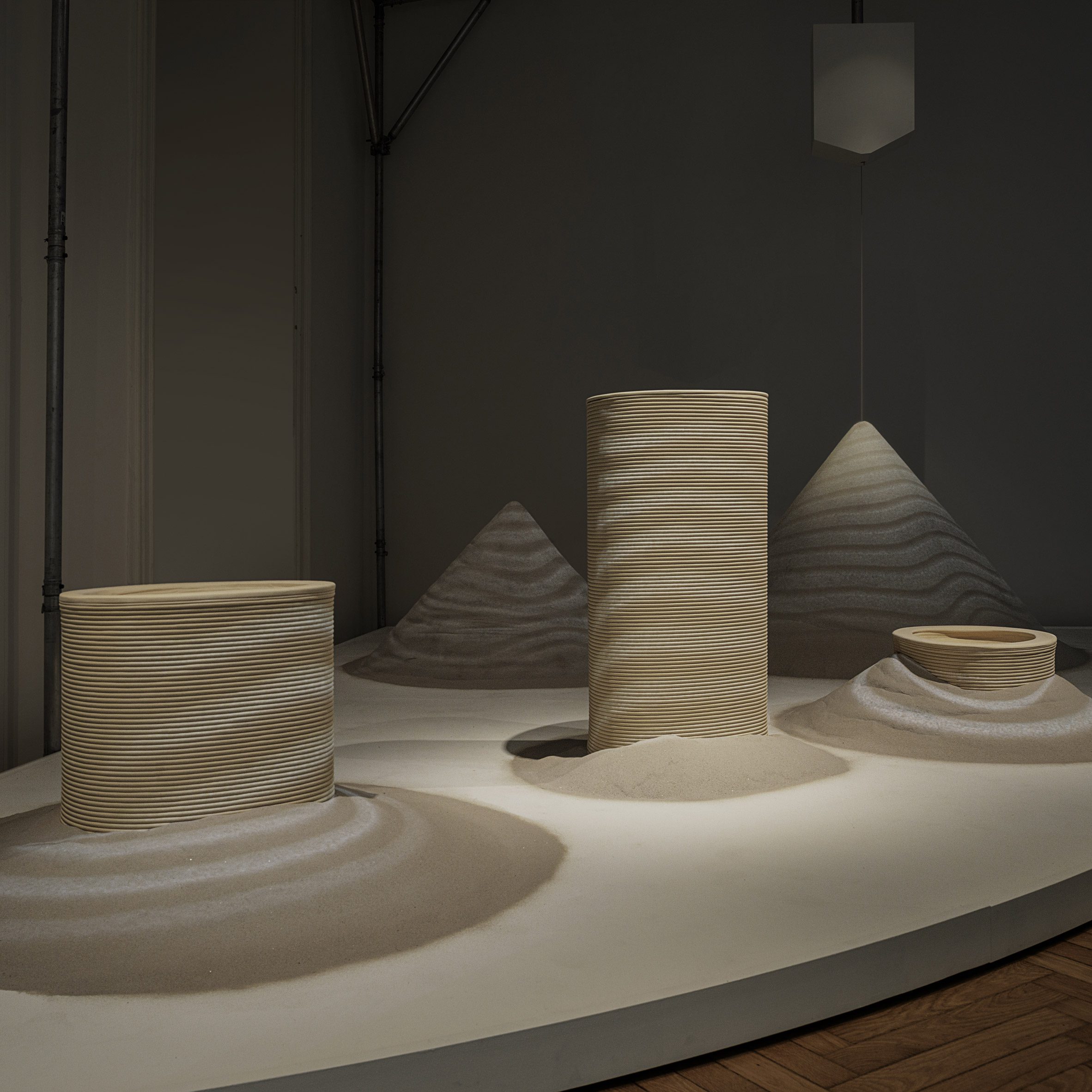 La instalación consiste en un silo que libera arena fina sobre un montículo central, lo que activa un mapeo de proyección de las formas circundantes para visualizar cómo los materiales desechados se reprocesan para convertirlos en nuevos productos.