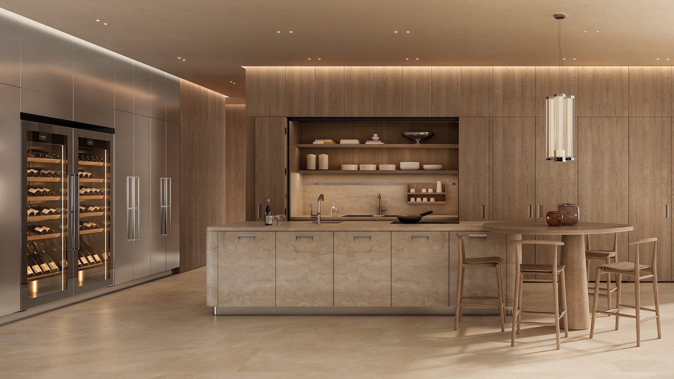 donde se encuentran las curvas fluidas, la presencia escultórica y la materialidad general Coradiseñado para ser el corazón de su cocina, integrando la preparación, cocción y almacenamiento de alimentos.